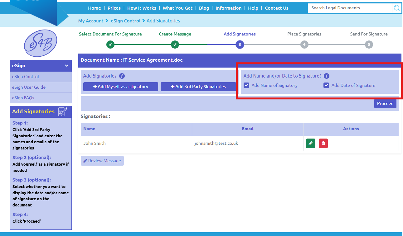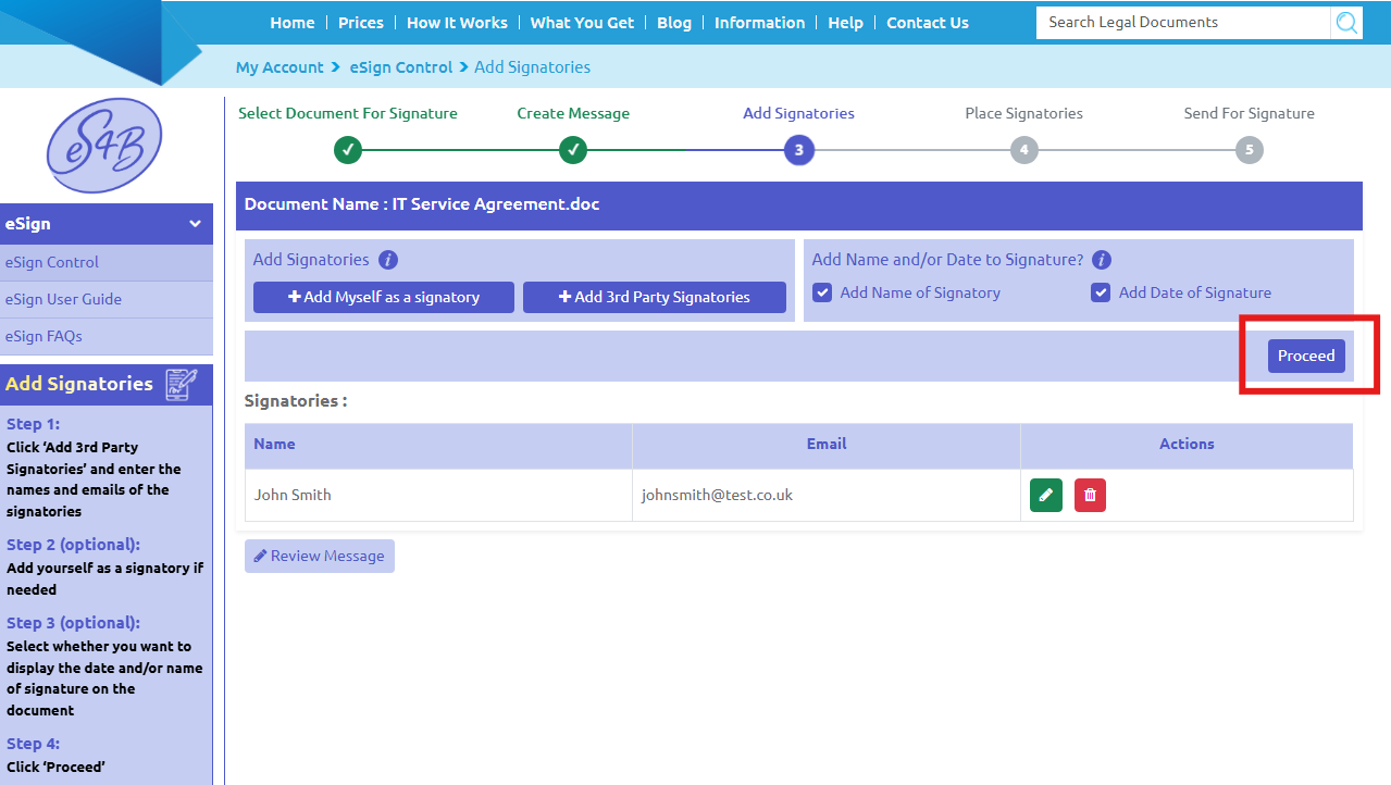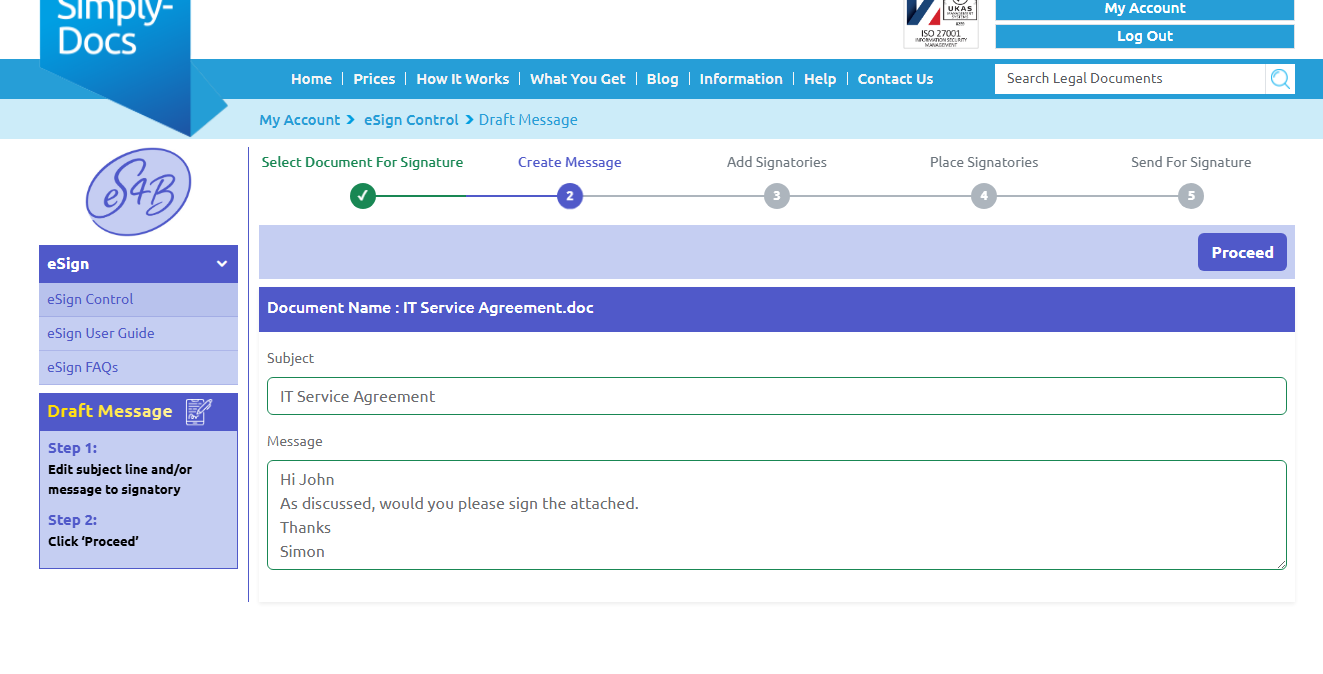 Enter the Subject details and message content. This message appears in the email sent to the signer(s). Then press Proceed.